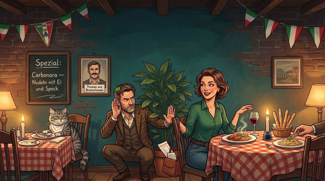 Maren hat ein Date. Tobias, Ingenieur, Bumble, nach rechts gewischt. Der Erzähler hätte sich eine Begegnung im Regen gewünscht, vielleicht in einer Buchhandlung, eine Hand, die gleichzeitig nach demselben Buch greift. Stattdessen: Luigi’s in der Oldenburger Südstadt. Pizza, Carbonara und ein Besitzer namens Thomas aus Bremerhaven.