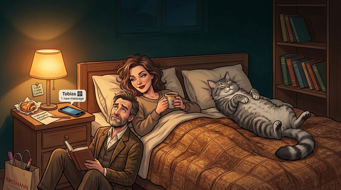 Bei Luigi’s wird es dann ernst. Tobias baut Brücken, hat einen Labrador und eine leichte Katzenallergie. Nur Niesen. Der Erzähler hätte sich narrativ mehr erhofft. Zwischen Saltimbocca und Panna Cotta passiert etwas, das der Erzähler nicht beschreiben darf. Weil Maren es ihm verbietet. Und weil manche Dinge nur ihr gehören.