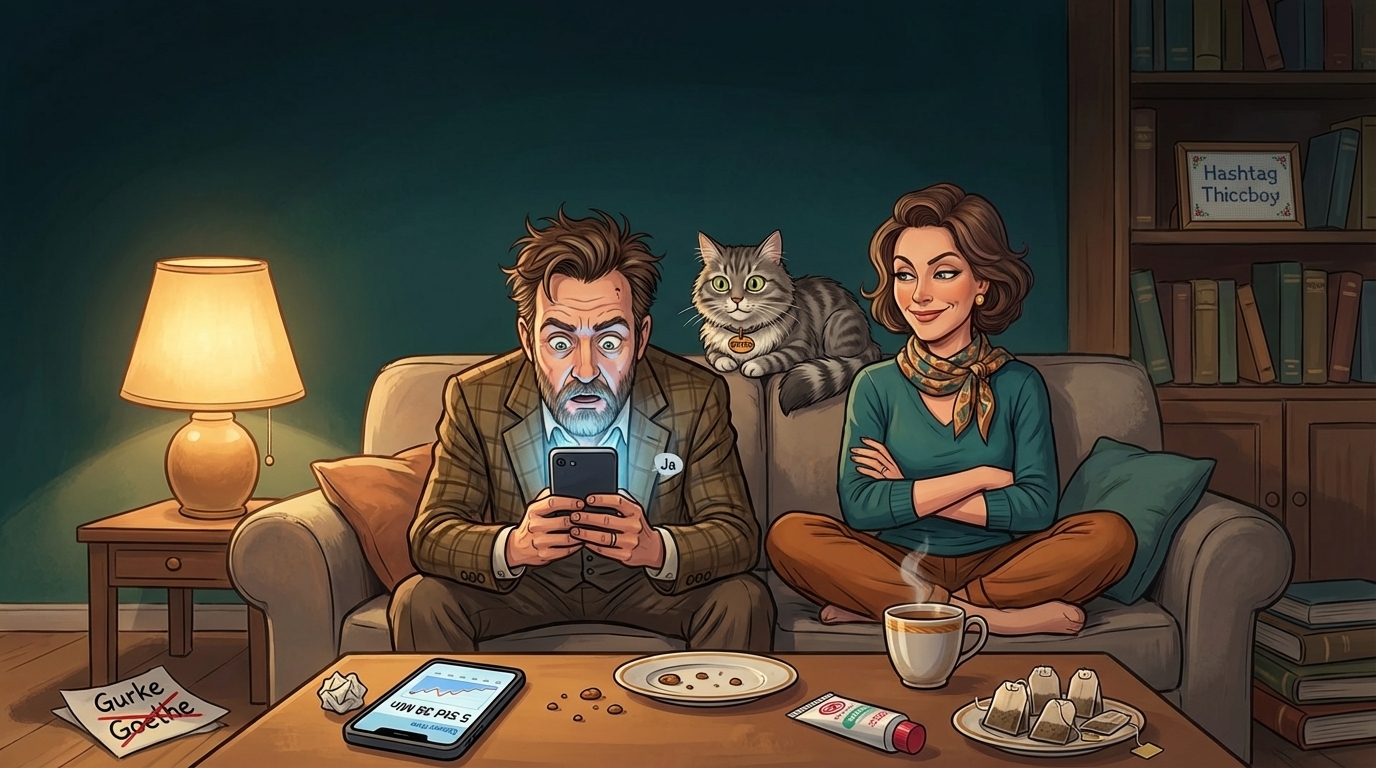 Maren zeigt ihm alles: Gruppenchats, in denen acht Menschen gleichzeitig reden und niemand zuhört. Instagram, wo ihre Carbonara dreiundfünfzig Herzen bekommt und Dieter der Kater hundertsieben. TikTok, wo ein Mann fünfzehn Sekunden tanzt und vier Millionen zuschauen. Und die Autokorrektur, die Goethe in Gurke verwandelt.