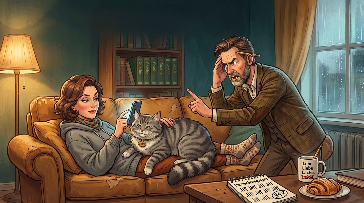Manche Sonntage beginnen mit dem Vorsatz, etwas Sinnvolles zu tun. Und manche Sonntage beginnen auf einem Sofa in Oldenburg, mit einem Kater auf dem Bauch und einem leuchtenden Rechteck in der Hand. Seit drei Stunden. Dreihundertsiebenundvierzig Daumenbewegungen. Der Erzähler hat gezählt.