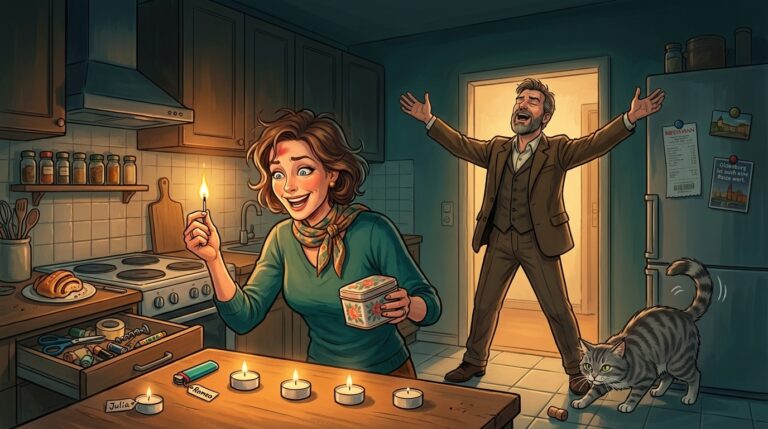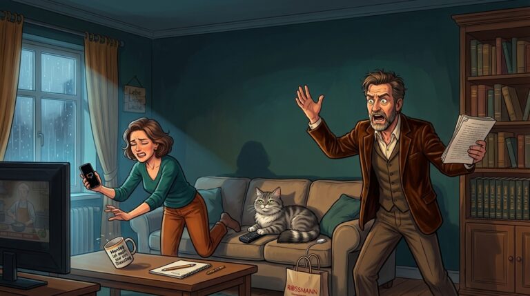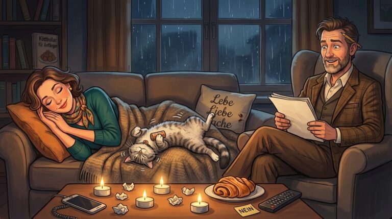 Was folgt, ist eine Odyssee durch die eigene Wohnung, bei der Maren gegen den Couchtisch läuft, den Türrahmen findet (mit der Stirn) und ein leeres Feuerzeug entdeckt, das der Erzähler sofort mit Romeo und Julia vergleicht. Nur mit Wachs und Butan. Doch irgendwann brennen vier Teelichter, Dieter jagt einen Korken durchs Dunkle, und zwischen Lachtränen über Kissenbezüge mit Lebe-Liebe-Lache und einem Rant über kubistische Röntgenbilder passiert etwas, das im Hellen nie passiert wäre.