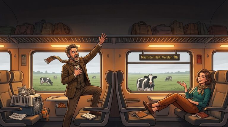 Es gibt Zugfahrten, die verändern alles. Und es gibt Zugfahrten zwischen Oldenburg und Hannover, auf denen ein Erzähler mit sieben Semestern Germanistik nach acht Minuten feststellt, dass Niedersachsen so flach ist, dass man sehen kann, wer übermorgen zu Besuch kommt.