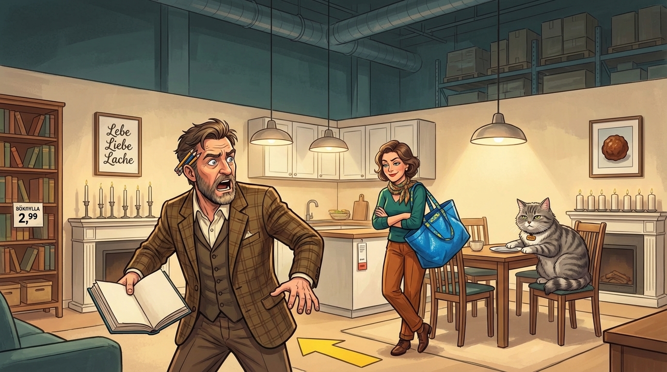 Betritt zum ersten Mal ein schwedisches Möbelhaus. Mit sieben Semestern Germanistik, kultureller Überlegenheit und der festen Überzeugung, dass gelbe Pfeile eine Kapitulationserklärung an den freien Willen sind. Scheitert an Showrooms, festgeklebten Büchern, wortlosen Anleitungen und einem schwedischen Produktnamen, der ihn für immer verfolgen wird. Gibt am Ende zu, dass die Bleistifte ganz okay waren.