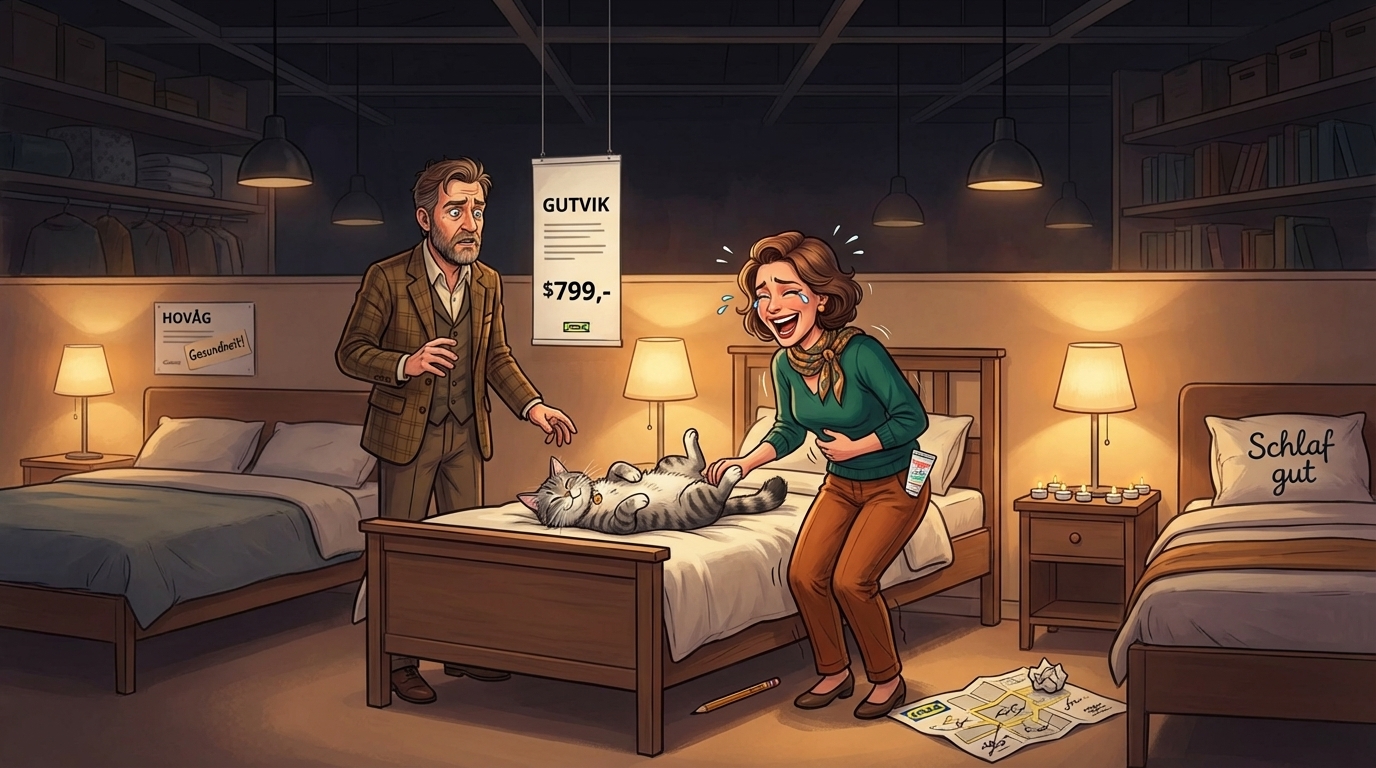 Was folgt, ist eine Expedition durch blau-gelbe Welten: Showrooms mit Familienfotos von Menschen, die es nicht gibt. Bücher, die an Regale geklebt sind. Leere Seiten. Toiletten ohne Anschluss. Ein Bällebad namens Småland, das entweder Erleuchtung oder Wahnsinn ist. Gelbe Pfeile auf dem Boden, denen der Erzähler sich aus Prinzip verweigert, nur um dreimal vor den Spülbecken zu landen. Und dann, in der Bettenabteilung, ein Name. Ein schwedischer Produktname, der alles verändert. GUTVIK. Mehr wird nicht verraten.