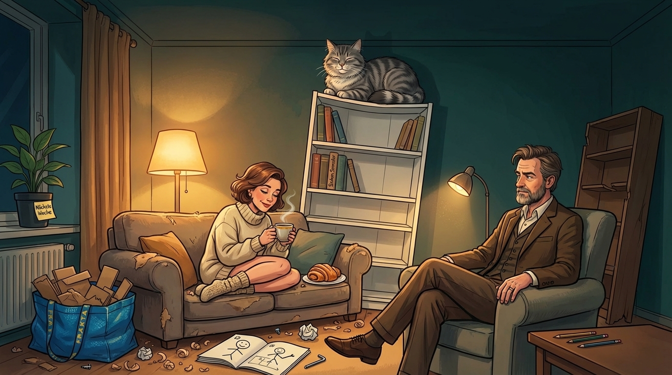 Danach wird gebaut. Mit Bildanleitung, lächelnden Strichmännchen, siebzehn verschiedenen Schrauben und einem Kater, der eine davon unters Sofa schiebt. Das Ergebnis: ein BILLY-Regal mit einem Neigungswinkel von drei Grad nach links und einem neuen König auf dem obersten Fach. Kostenlos anhören und miterleben, wie ein Erzähler an IKEA scheitert, aber am Hot Dog für eins fünfzig fast Frieden findet.
